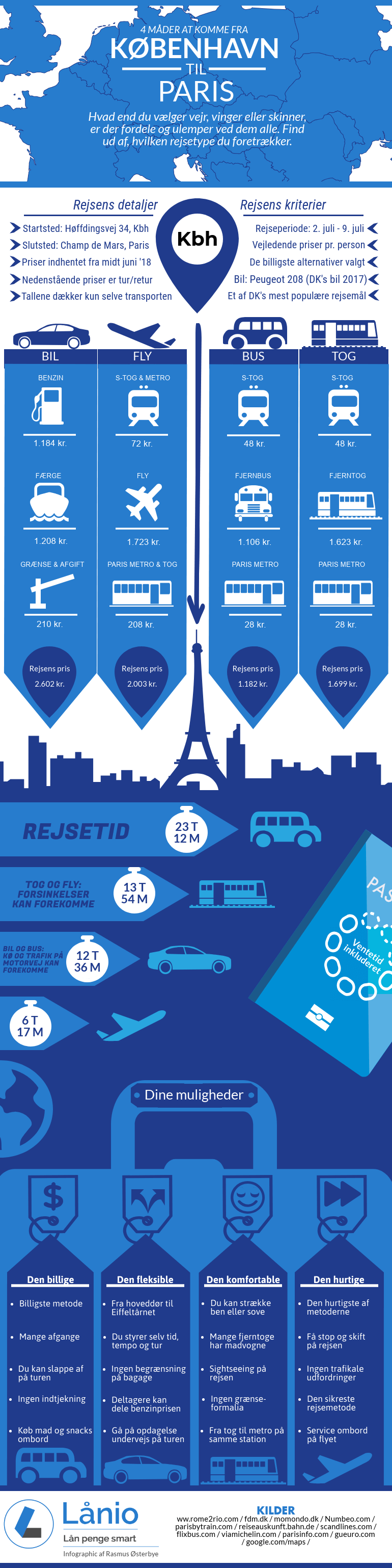 Lånio.dks undersøgelse tager udgangspunkt i fire konstanter: Dato, billigst pris og start- og slutpunkt. Rejseperioden sat til at være fra d. 2. til 9. juli 2018 (tur/retur). Derudover er der forsøgt at gøre hver af de forskellige rejsetyper så billig som mulig. Slutteligt så er startpunktet altid Høffdingsvej i Valby og slutpunktet altid Champ de Mars, som er adressen på Eiffeltårnet. Således får du også et opdateret billede af, hvordan din rejse ser ud i 2018.