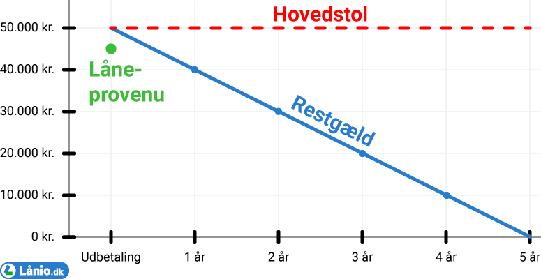 - Den blå linje repræsenterer restgælden, som starter ved hovedstolens værdi og gradvist falder over tid, da låntager betaler lånet tilbage.
